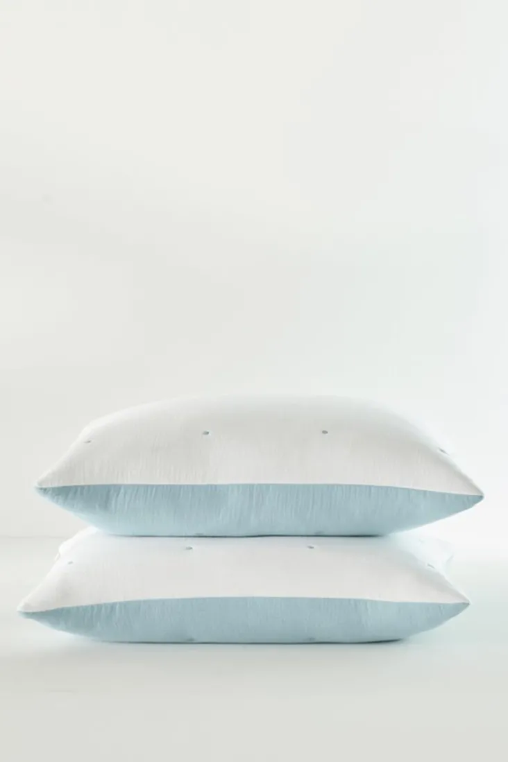 Enjoy two looks in one with this two-toned crinkle gauze sham, which can be reversed from blue to white as the mood strikes you. Detailed with stitched tucks and a clean, knife edge finish, it’s a serene addition to your bedroom.