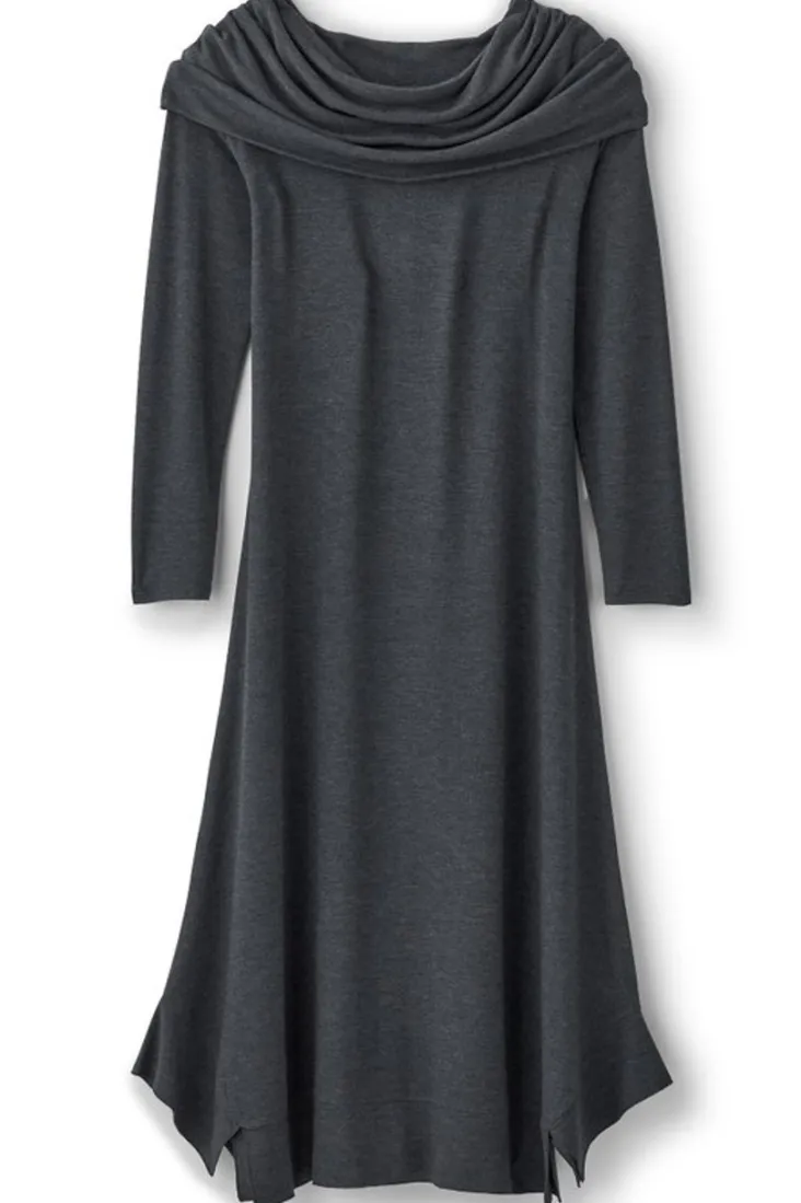 With an alluring drape at the neck and flow of the angled hem, this slimming knit dress has more than a hint of Hollywood glamour. Depending on the occasion, its oversized cowl can be worn gathered in front, back or skimming the shoulders.