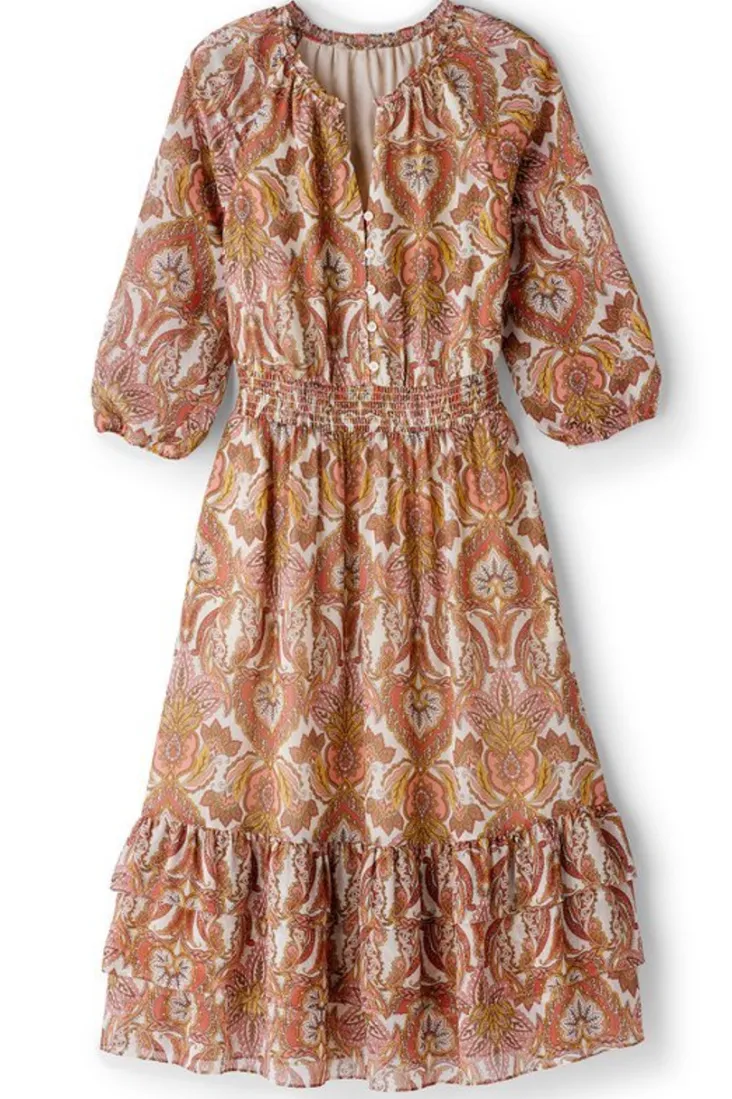 We’re swooning over this midi. From the Jacobean scroll print to the airy crinkle chiffon, it has an ethereal, romantic quality you’ll want to wear all year-round from date nights to hosting. A partial placket of faux shell buttons leads to a comfy smocked waist for gentle shaping. While ruffle details and 3/4-length blouson sleeves add a feminine flourish. Side seam pockets make it ready for anything, too. Lined.