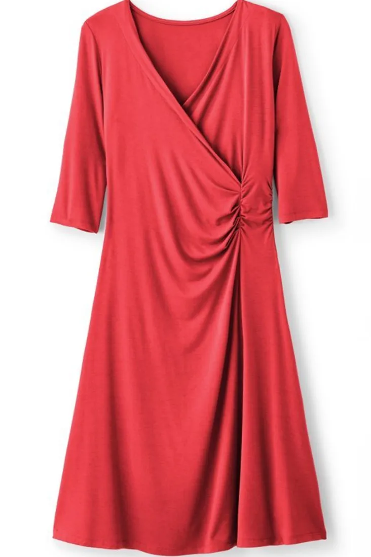 The beloved wrap dress has always been a style icon and this faux wrap design has long been a Soft favorite, now in a shorter length. Shirring detail at waist creates the perfect hourglass figure. Elbow-length sleeves.