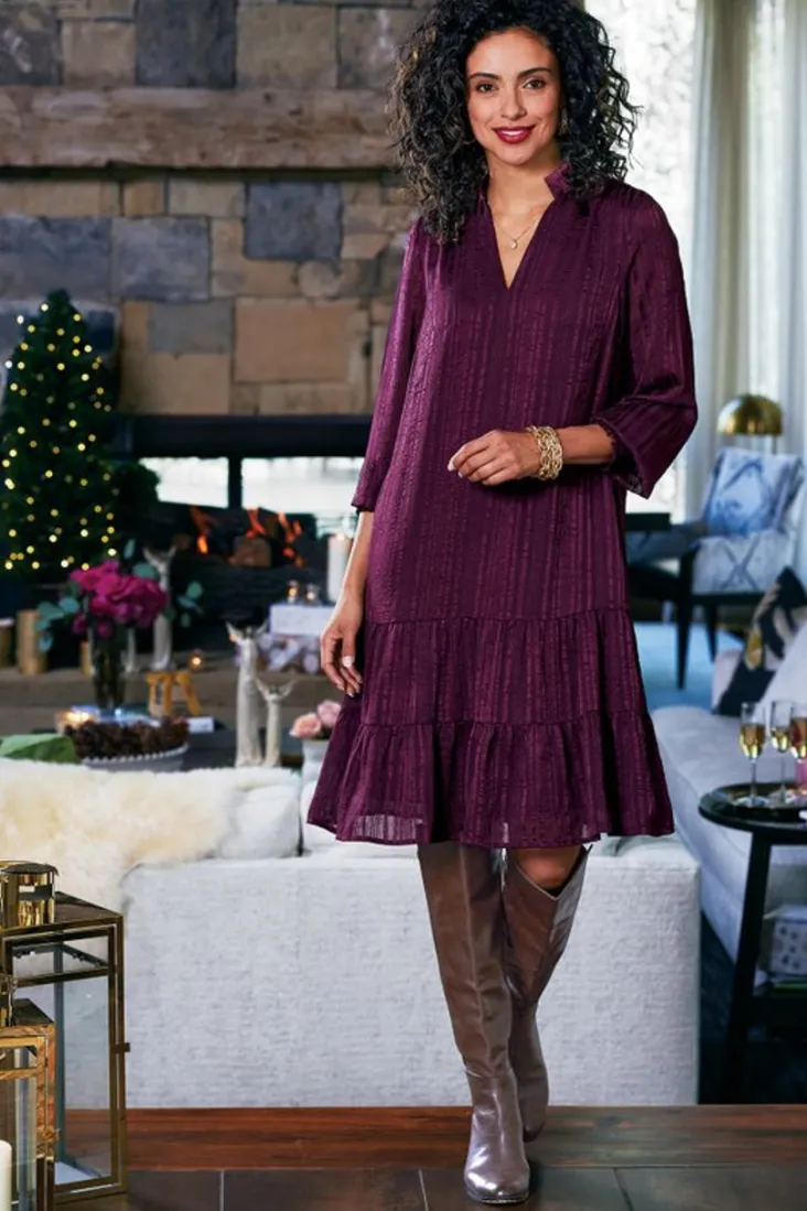 You love our Jocelyn top, so get ready to shine in our Jocelyn Dress. From the stand collar to the smocked cuffs and skirt tiers, it’s pure elegance in a crinkled shadow stripe. Pockets for wear-anywhere ease and knee length to pair with everything from ankle- to knee-high boots.
