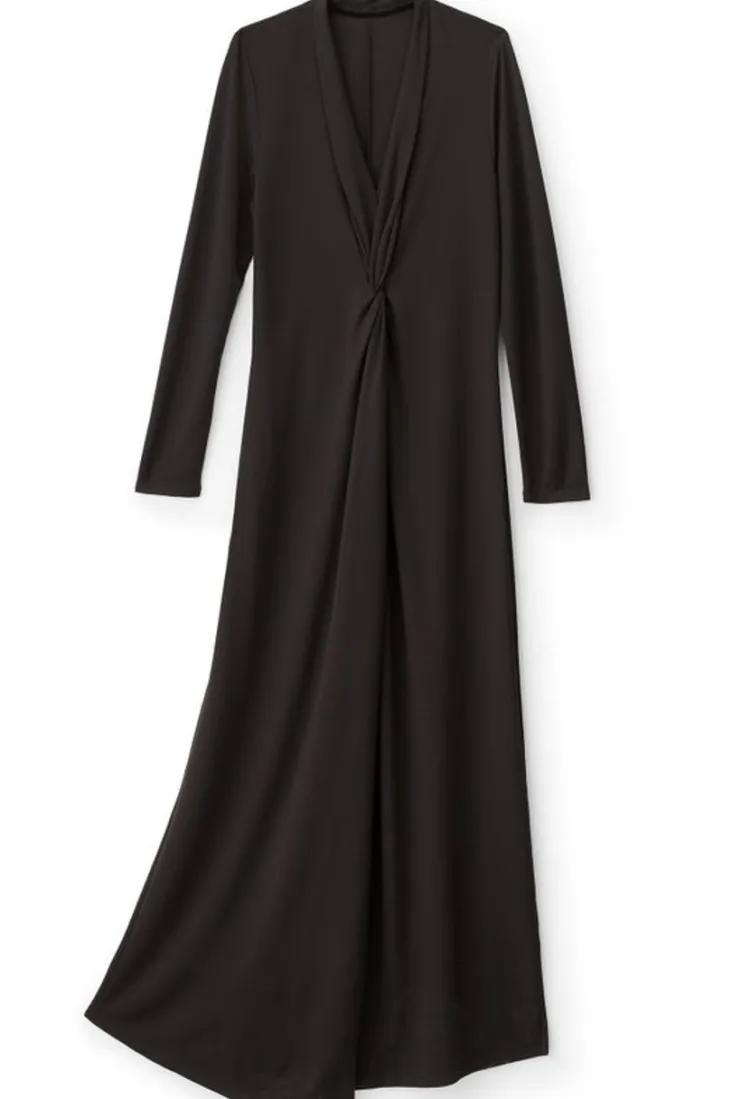 An amazing silhouette with center front twist and contoured ruching from V-neck to full sweep, in versatile ponte knit.