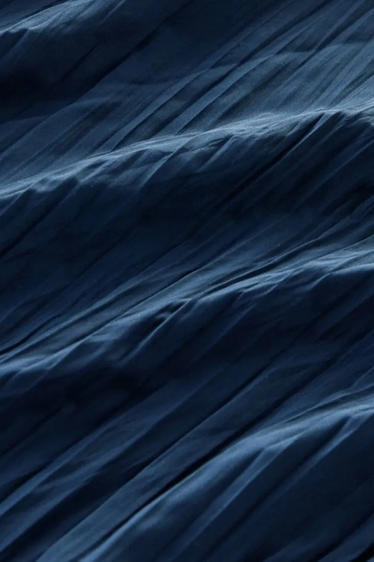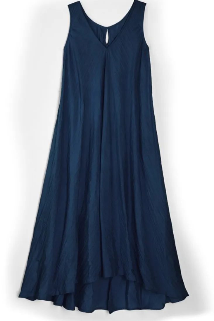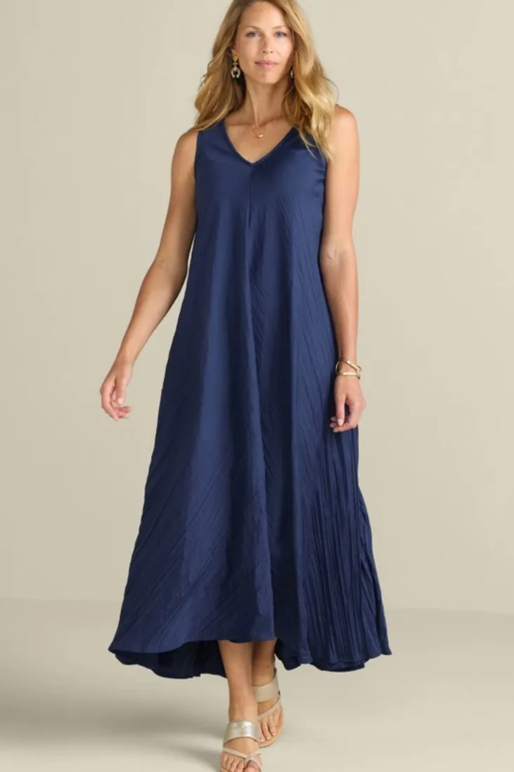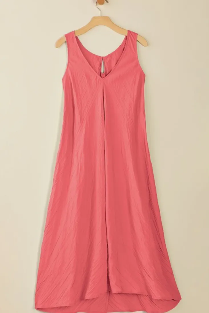 This sleeveless maxi boasts carefree crinkles and a flowy silhouette. Complete with a V-neck and keyhole back. Plus, a curved high-low hem with back slit so you can show off your shoes.