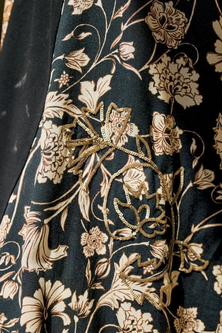 Cue the contrast solids and prints, wovens and knits. An easy knit dress with printed woven panels, plus metallic embroidery and embellishments. The scoop neck with front button-closure keyhole is charming, while the back hook-and-eye closure zipper is convenient. Long sleeves for endless versatility.