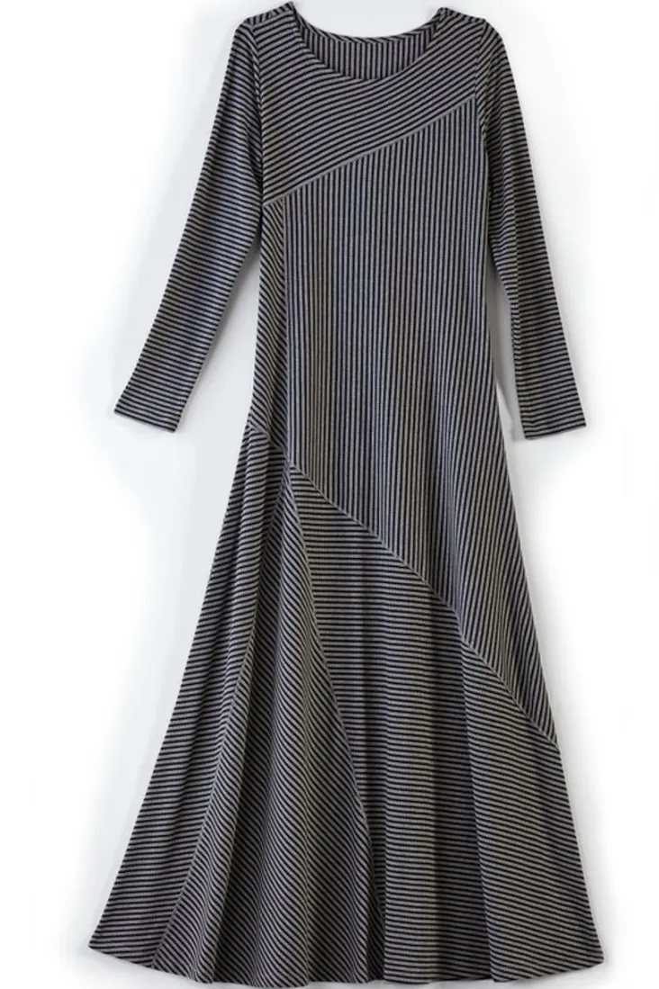 Hello slimming slanted stripes. This maxi of soft ribbed knit is cut with diagonal seaming and multi-directional stripes for a casual, confident look.