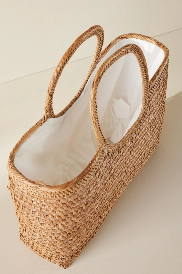 Girls’ brunch on the boardwalk or dinner dates al fresco , this woven straw bag breezes through them all. An interior lining with a drawstring closure keeps your essentials secure. While its structured body and rounded handles make it a chic complement to summer outfits. Natural straw, cotton/poly textile lining, nylon drawstring.