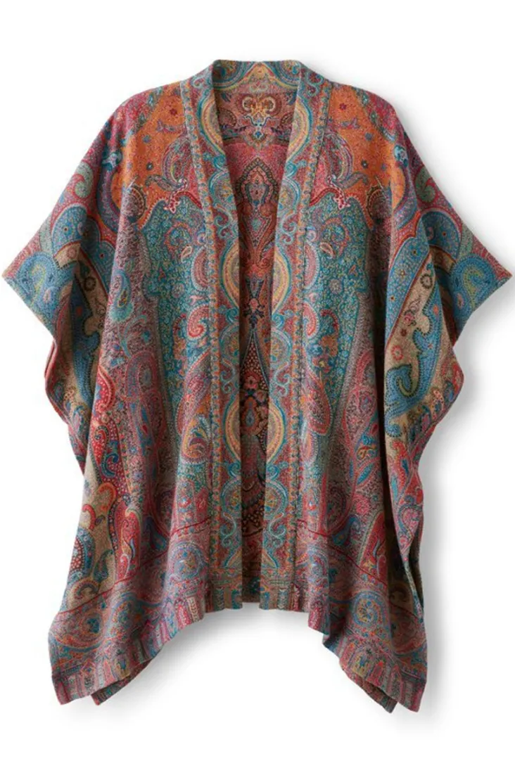 Stand tall with shoulders back in this handwoven showpiece. Swirls of allover paisley cascade down the drapey silhouette, making it an artful addition to any outfit.