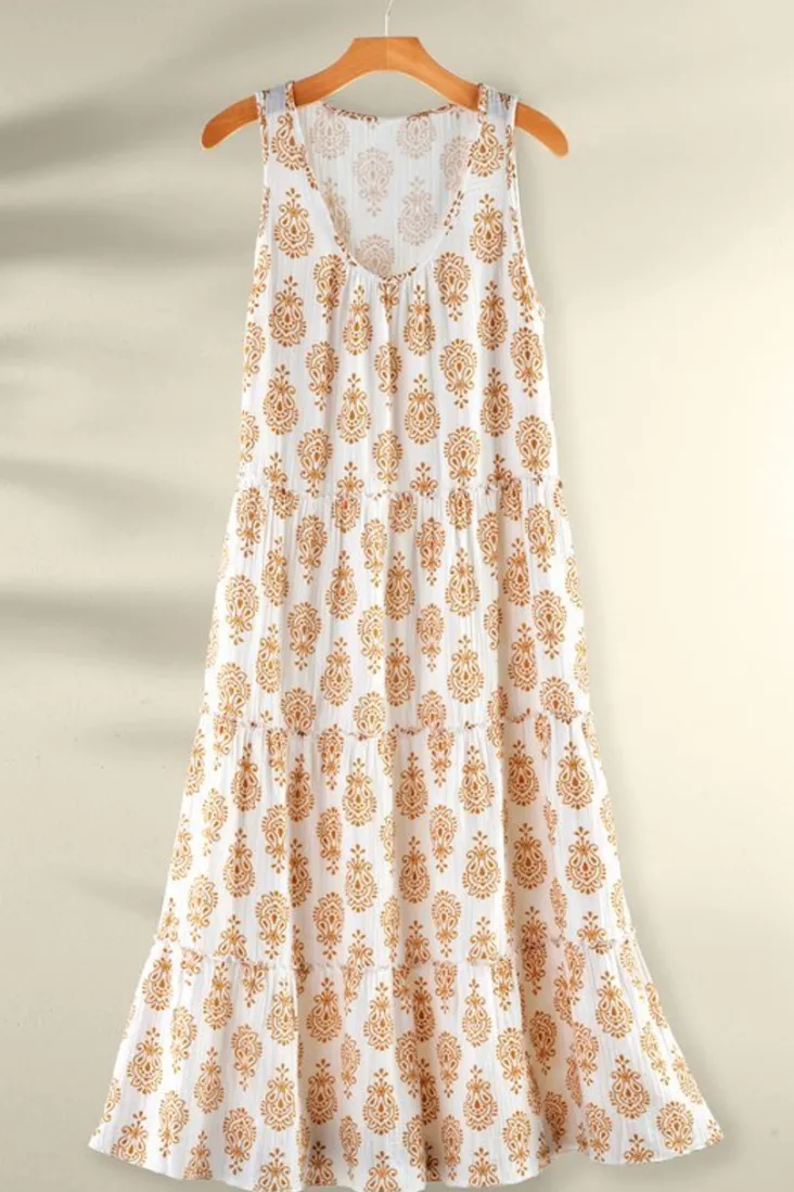 We love the ease and elegance a night gown brings to bedtime and lazy days at home. Soft, breathable bubble gauze keeps you cool and comfy through the night, while flowy tiers in a maxi-length give you the floaty coverage you crave. Finished with a golden medallion print, it’s a lavish look you’ll be tempted to wear all the time. Pair it with the matching robe (2GN88) for the full effect or go for the tank (2GN89) and crops (2GN90) combo for the complete Amaria Nights suite. Misses 50 in long.
