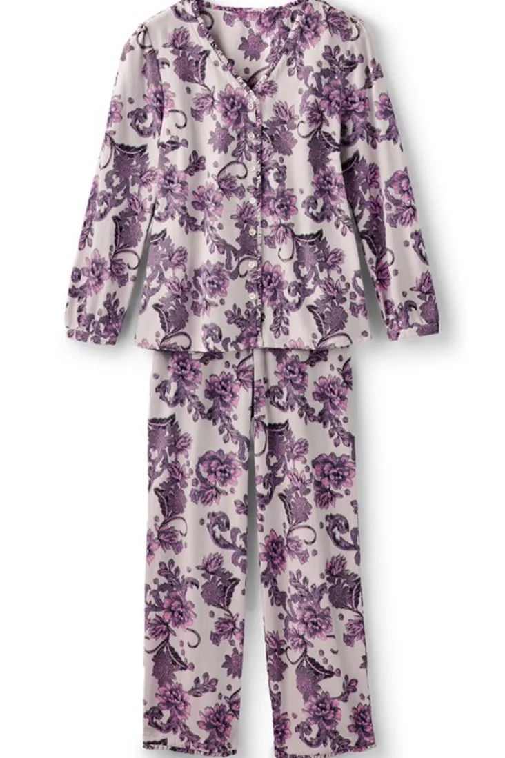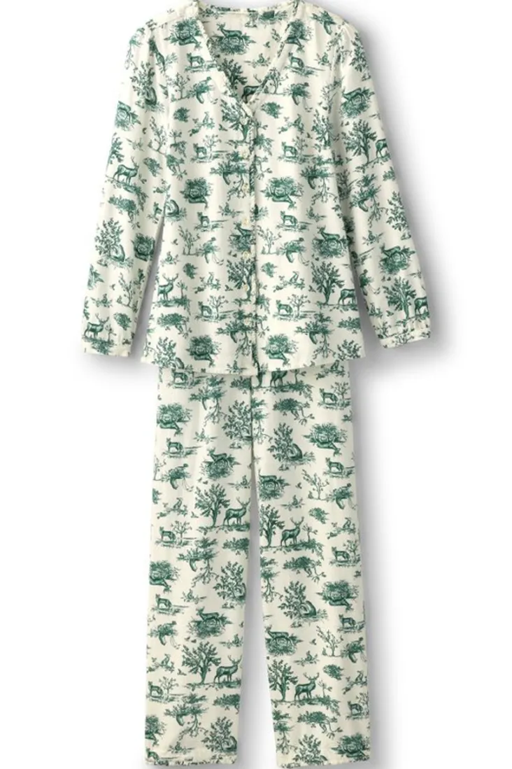 Scrumptiously soft from the collar to hems, our flannel is brushed on both sides so it’s twice as snuggly on a cold winter’s night. Easy-on, this set has a button-front top and pull-on pants with a satin drawcord, and it’s finished with a festive print that’s sure to put you in the holiday spirit.