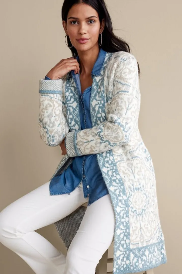Like a wearable blanket, this longline cardi is delightfully toasty for gathering around the fire pit with good friends or nestling on the sofa with your latest novel. The open style features a lovely medallion print in soothing shades of Wedgwood blue, dove grey, and oatmeal on ivory. Single hook and eye at waist.