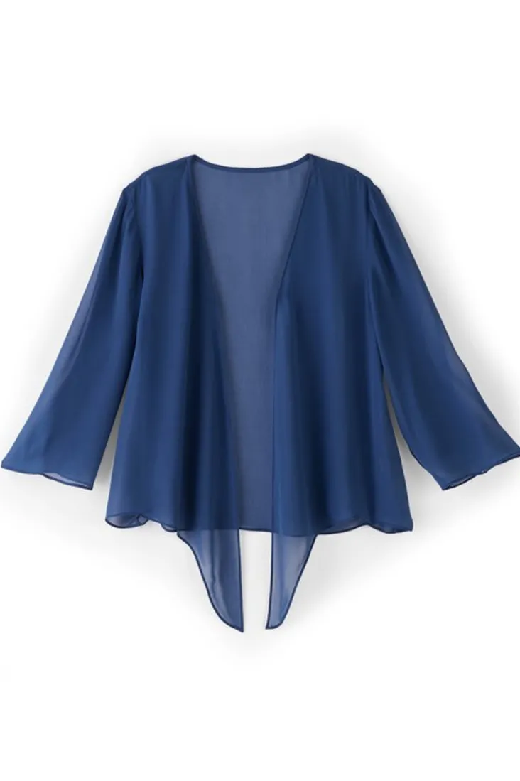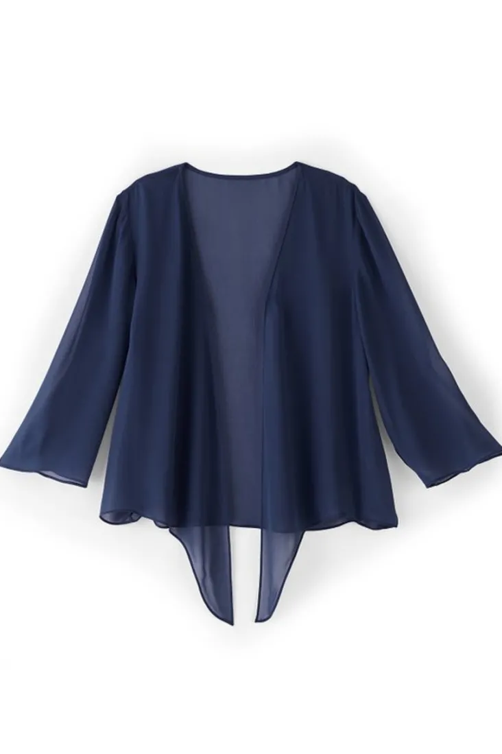 Sometimes all you need is a light layer to tame the evening (or a/c) chill. This simple silk topper is so effortless, but looks so stylish tied atop your favorite dress, tee, or tank. 3/4 sleeves.