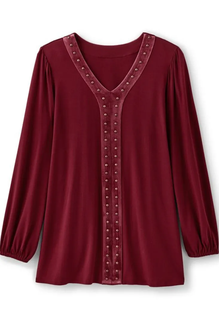 The silhouette is all romance, but the detail has that stylish edge you love. Poet-style knit top drapes beautifully with V-neck and shirred blouson sleeves. Contrast velvet trim on the front shines with edgy stud detail.