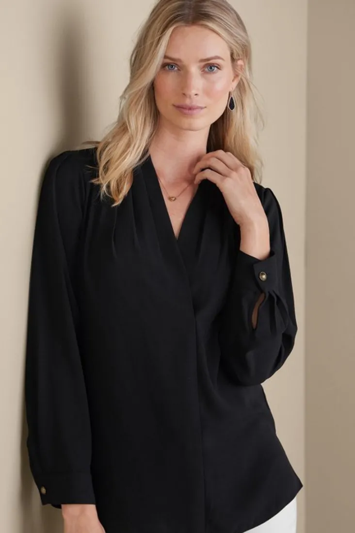 Every closet needs a can’t-miss blouse a refined layer that seamlessly works across your entire wardrobe. Pretty pleating makes the crossover V-neck of this blouse drape so beautifully, while hammered buttons finish the long sleeve cuffs. Side slits.