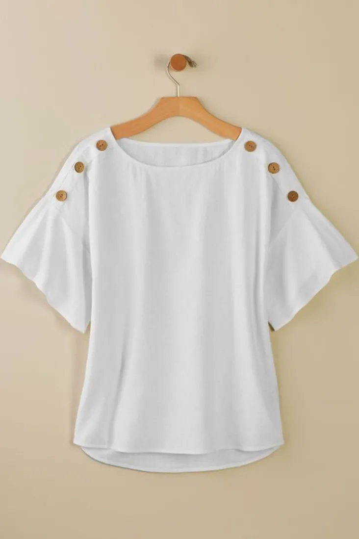 Slip into this easygoing boatneck top for carefree sunshine season style. Made from a lightweight linen blend, this relaxed design features drop shoulder sleeves and button details along the shoulder seam. A flattering curved hem looks great with shorts, crops, or leggings.</div>