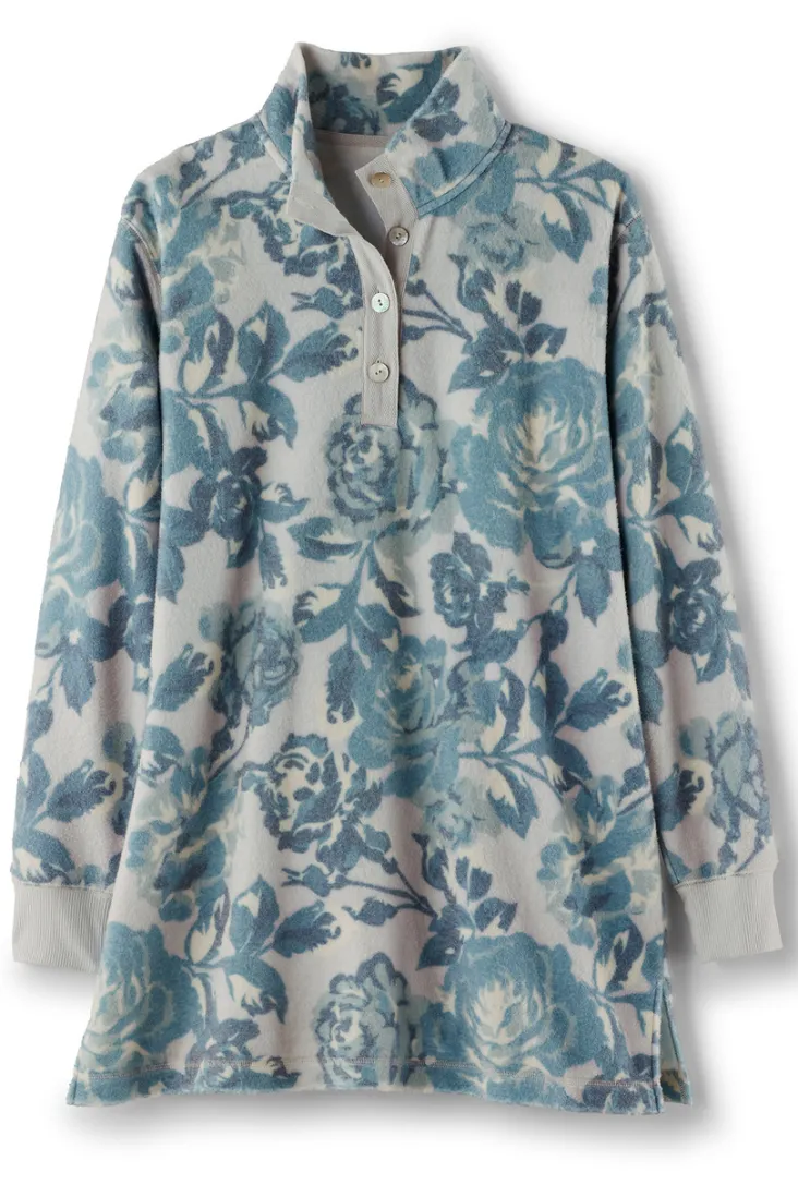 Caressably cozy, this fleecy, oversized style features a twill placket and small side slits.