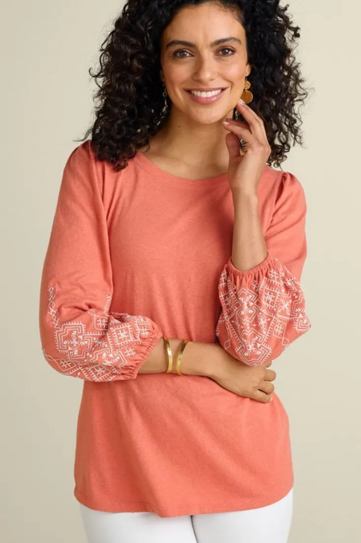 Everyday ease meets delightful detail on this stitch-perfect scoop neck. Intricate embroidery gives 3/4-length puff slee…