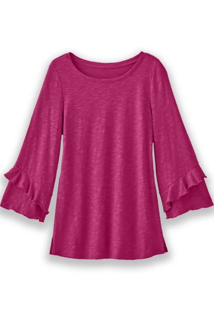 Cascading ruffles trim the 3/4-length sleeves of this boatneck tunic. Knit fabric in a linen-cotton blend keeps this style easy-breezy, whatever the weather.