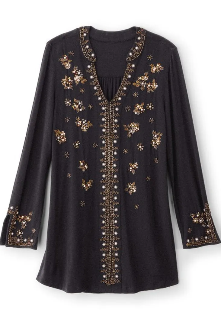 Delightful embellishment graces this versatile tunic inspired by faraway lands. Rich beading accentuates the design from the flat Mandarin collar, down the V-neck and center front, across the bodice and at the vented sleeve hems. Even the back yoke has a touch of the exotic.