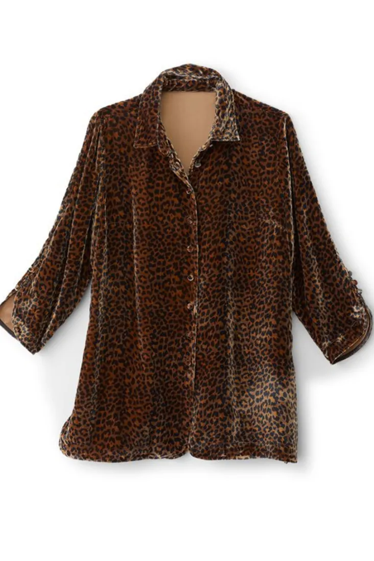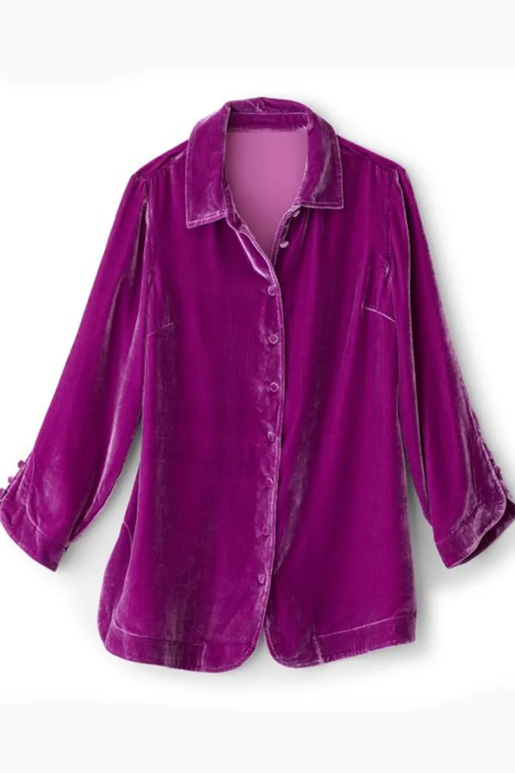 Lavish the hours in our lush and silky velvet blouson, with curved openings at full front placket and button-detailed 3/4 sleeve openings, bust darts, and side-slit hem.