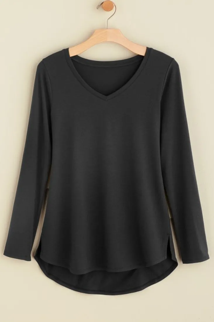We crave softness in our basic tees and this V-neck is so soft! We designed it with Pima cotton, the softest cotton on the planet, with just a whisper of stretch to maintain its shape. The curved hem dips slightly longer in back with petite side slitsadding extra ease.
