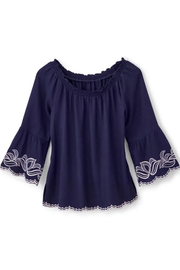 Enjoy two looks in one courtesy of this embroidered A-line top, which can be worn on or off the shoulder thanks to the smocked neckline. 3/4-length bell sleeves complement the breezy silhouette, fashioned from a soft and drapey fabric with a linen-inspired texture. Scalloped details at the hem and sleeves complete this look, which pairs perfectly with denim, shorts, or crisp white pants. Side slits.