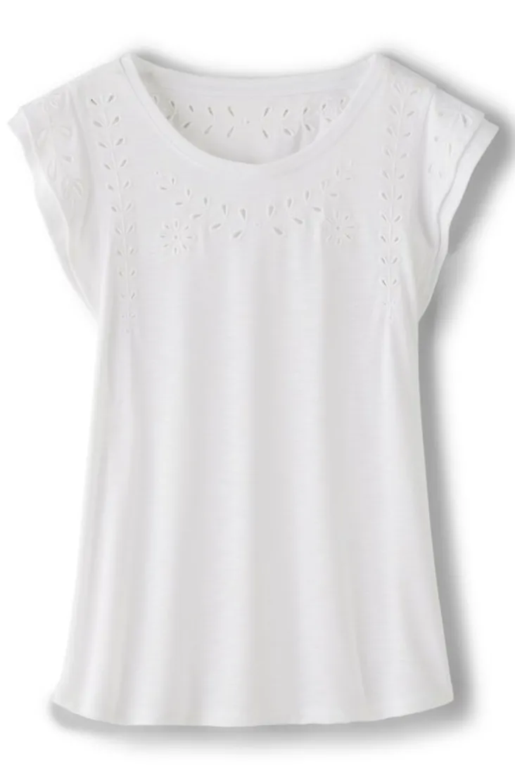 Libby is far from your ordinary tee. First, the fabric’s so soft and ever-so-subtly textured. Second, those details! From the eyelet embroidery to the ruffled cap sleeves, the details take this tee from an everyday basic to an elevated essential. And if you’re worried about underarm coverage, don’t be, we included gussets to keep you confident and comfortable as can be.