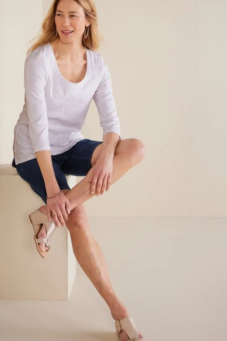 Tonal allover embroidery adds subtle texture to this classic cotton tee with a scoop neckline and 3/4-length sleeves.Thi…