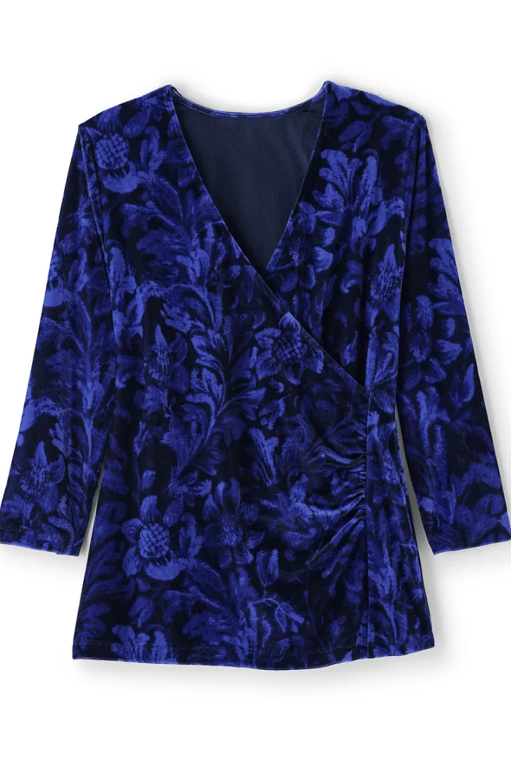 Finished with flattering ruched detail, this touchably soft velvet style is a luxe reimagining of your favorite surplice top. 3/4 sleeves. Front bodice lining.
