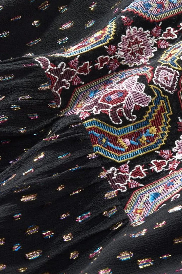 Take a shine to this shimmery tunic sprinkled with metallic details. The split neckline ends at an enchanting, embroider…