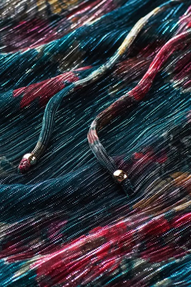 Crinkled plisse sways and sparkles, while a ruffled split neck and sheer blouson sleeves radiate pure romance. Beaded ne…