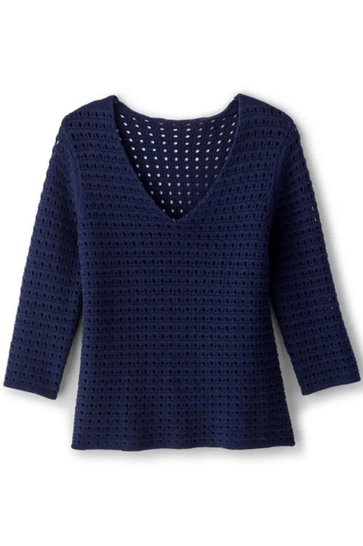 In an airy open knit, this cotton pullover is perfect for layering atop our Convertible Tank (2FU57). Its V-neckline and 3/4-length sleeves make for a timeless and versatile silhouette.