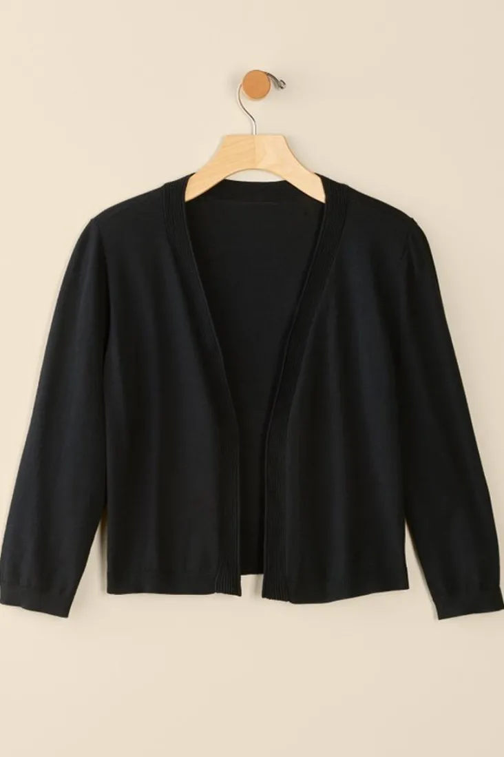 Everyone needs a classic cropped cardi in their closet and this should be the one. This 3/4-length sleeve style features an open-front design with decorative ottoman stitching at the placket. The perfect cardi to wear over dresses and pair with skirts, too.