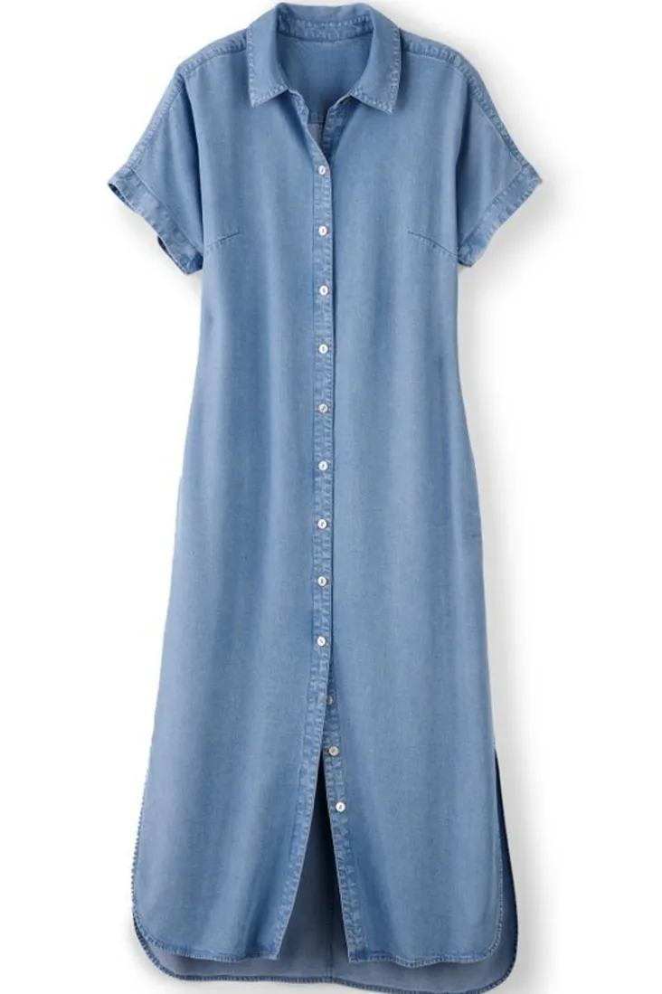 This easy-going, midi-length dress moves and drapes beautifully with soft and lightweight TENCEL™ Lyocell fabric. In a classic A-line shirtdress style with a button front, collar, short sleeves and curved hem. Plus, pockets, too! TENCEL™ is a trademark of Lenzing AG.