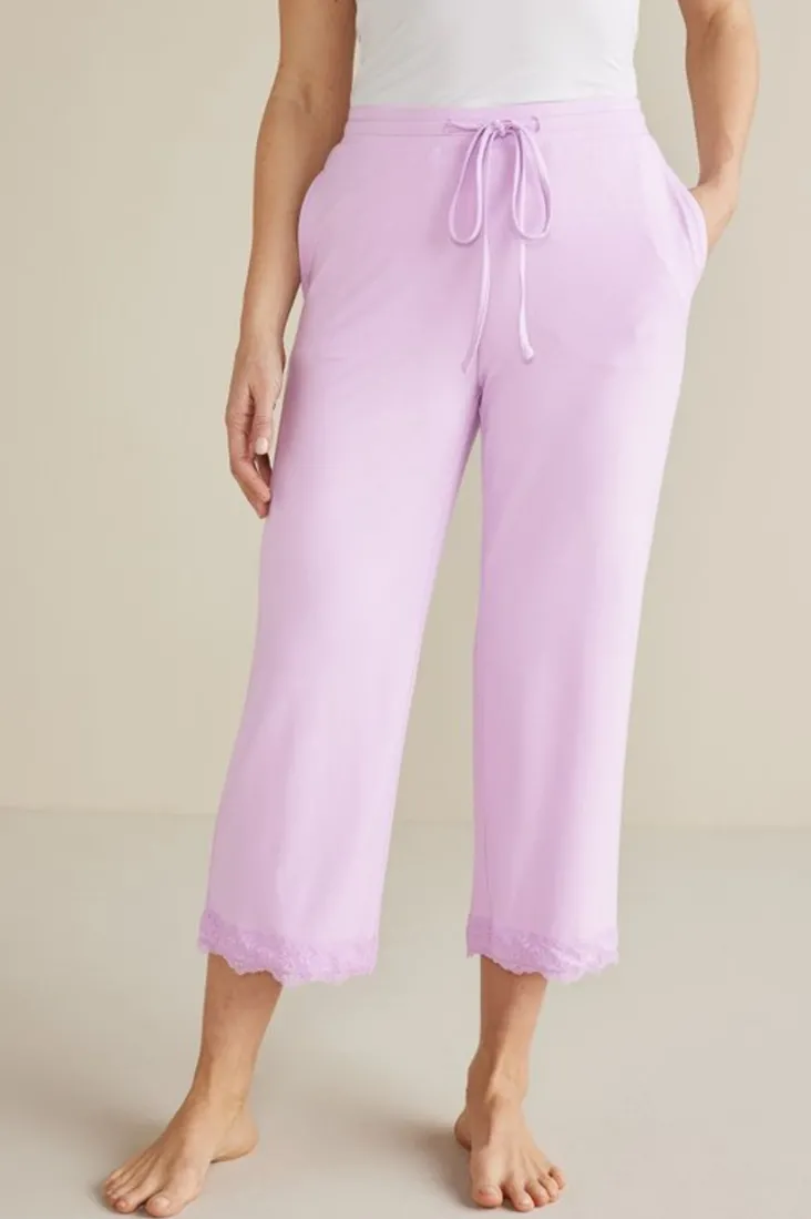 Relaxation has never looked so chic, or felt so comfy! These super-soft bamboo viscose jersey sleep pants are ready for lazy mornings or peaceful nights with an elasticized, drawstring waistband, side seam pockets, and pretty lace trim at the hems.