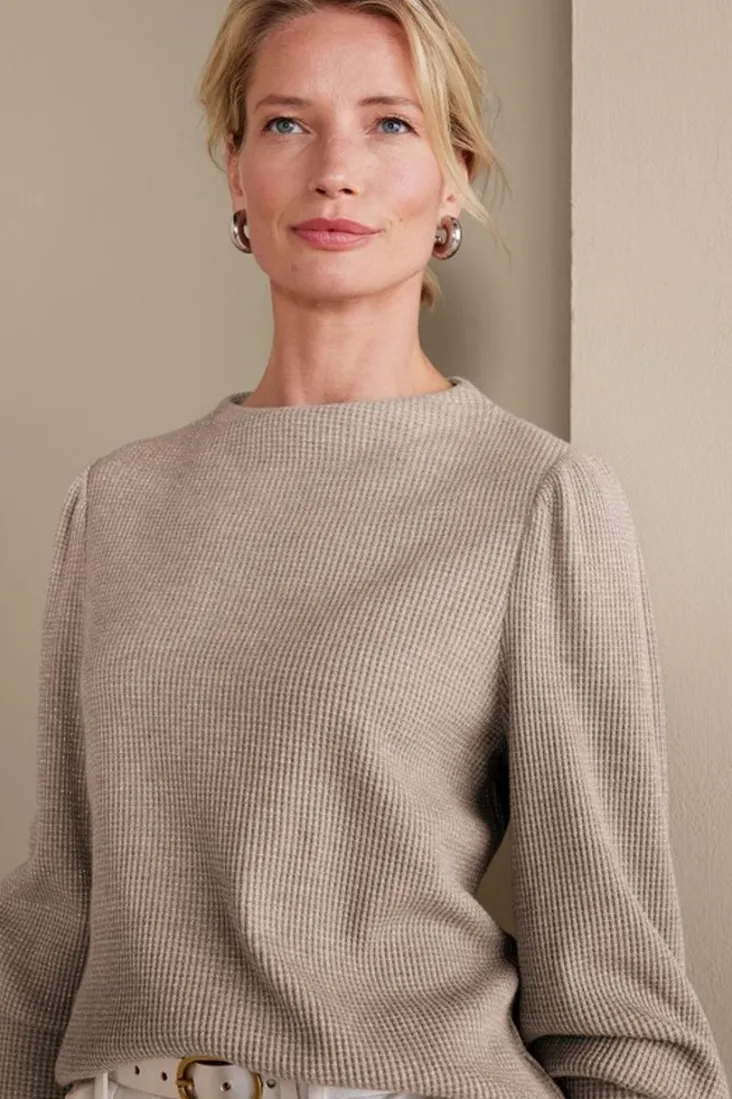 We refreshed the classic waffle knit top with a modern silhouette, featuring puff sleeves with deep cuffs and an architectural neckline. And then there’s the shimmer. Touches of silver sparkle are woven into the taupe knit for a cool, subtly festive look.