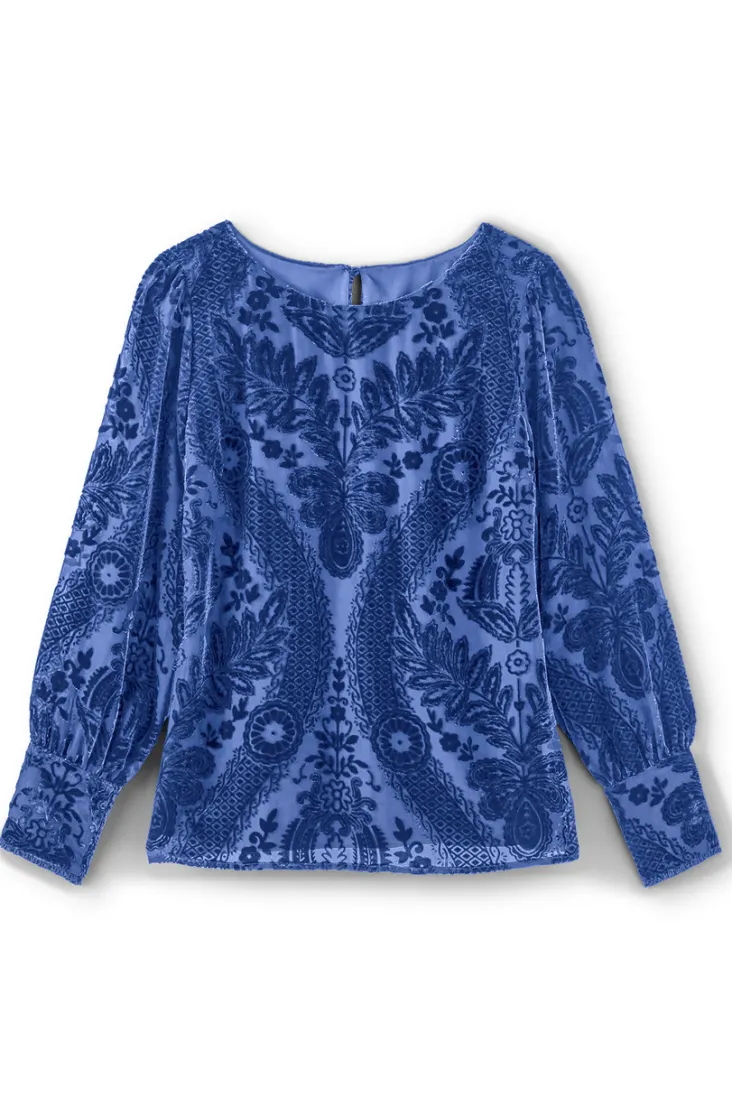 The burnout velvet detail is gorgeous. The hues are to die for. This floral top is altogether feminine and chic, simply magical for the holidays and beyond. Deep statement cuffs on the sheer, billowy sleeves are fastened with covered buttons. Lined body, keyhole back closure.