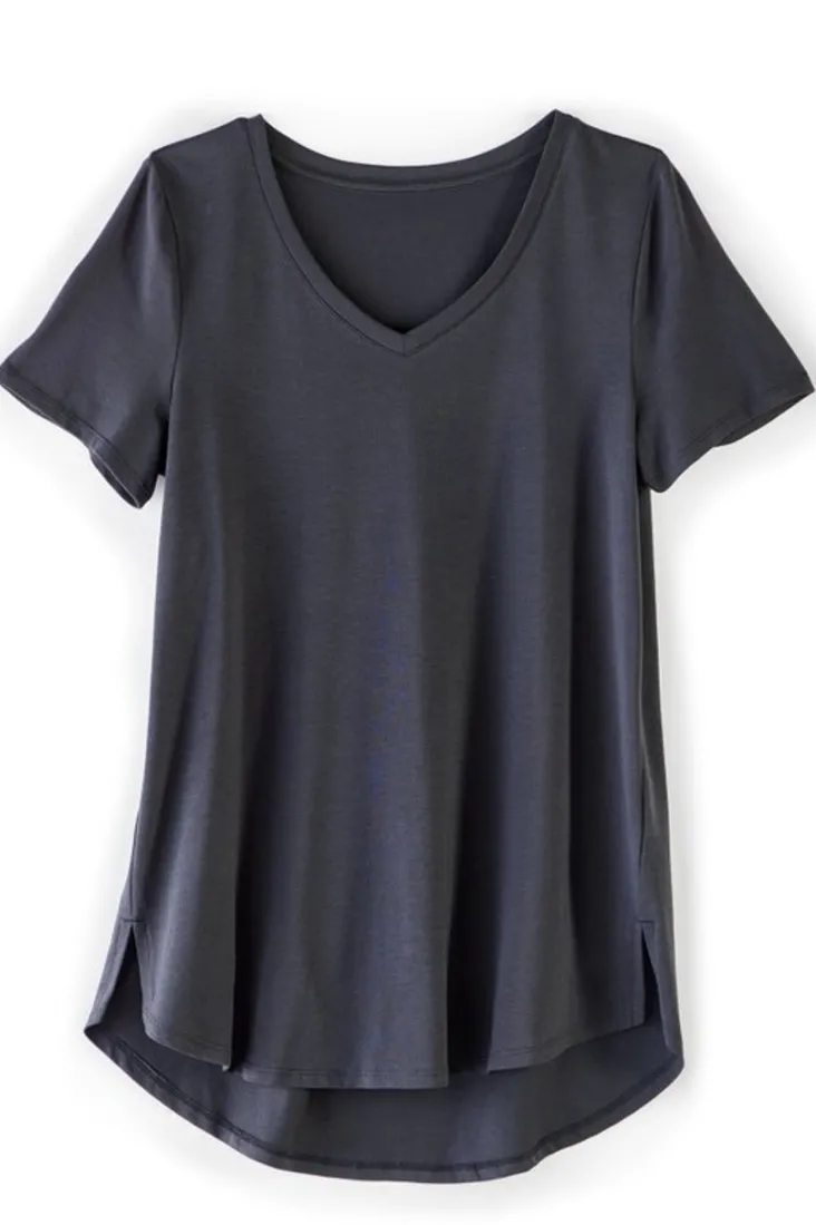 What sets this must-have cotton-blend tee apart are the styling details that make it a favorite for every day. The longer tunic length dips and curves in the back to boost the wearability with leggings, jeans, anything! It’s made from the softest Pima cotton with just the right hint of stretch so the shape always stays fresh. V-neck, short sleeves.